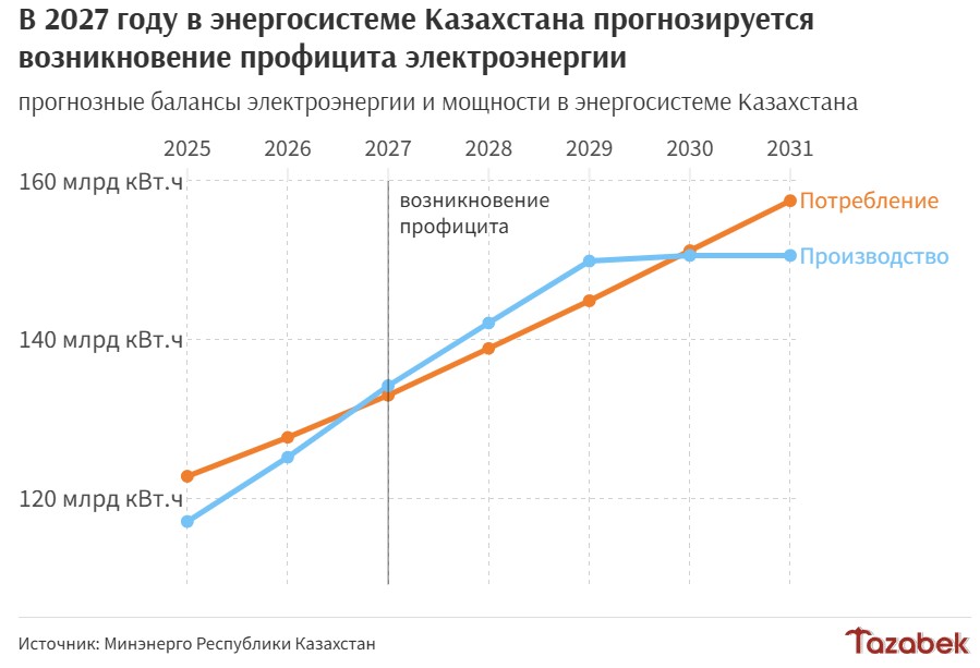 По прогнозу Минэнерго Казахстана, ввод объектов, по которым сейчас ведется работа, позволит уже к концу первого квартала 2027 года полностью покрыть потребность экономики в электроэнергии и вывести Казахстан из статуса энергодефицитной страны. К 2029 году ожидается выход на устойчивый профицит как электроэнергии.